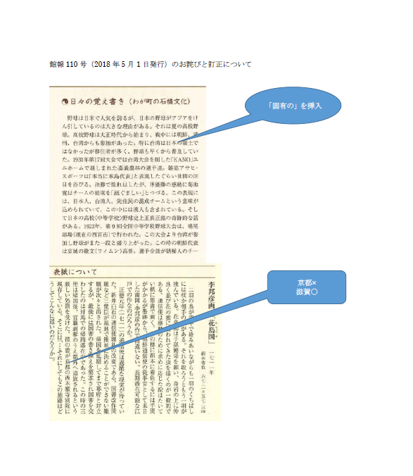 裏表紙「日々の覚え書き」「表紙について」につきまして、誤りがございました。謹んでお詫び申しあげます。
