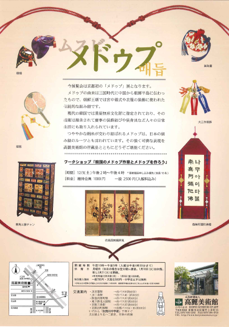 今展覧会は京都初の「メドゥプ」展となります。 メドゥプの由来は三国時代に中国から朝鮮半島に伝わったもので、朝鮮王朝では宮中儀式や衣服の装飾に使われた伝統的な組み紐です。 現代の韓国では重要無形文化財に指定されており、その技術は継承されて慶事の装飾結びや装身具など人々の日常生活にも取り入れられています。 つややかな絹糸が交わり結ばれるメドゥプは、日本の組み紐のルーツとも言われていま。強く可憐な表現を高麗美術館の所蔵品とともにご堪能ください。 ●開催期間/2016年12月3日(土)~2017年3月26日(日) ●開館時間/午前10時~午後5時(入館は午後4時30分まで) ●休館日/月曜日(祝日の場合は翌火曜日に振替。1月10日(火)は休館。但し3月21日(火)は開館)年末年始(12月26日~1月6日) ●特別展入館料/一般700円 大高生500円 中学生以下は無料 ※20人以上の団体と65歳以上の方は、1名様につき500円 ※障害者手帳をお持ちのご本人と付添いの方1名様無料 ●共催/韓国メドゥプ協会 ※本展覧会は特別料金となります。また、年末年始の休館を挟みますので、ご来館の際には日程をお確かめのうえ、お越しください。