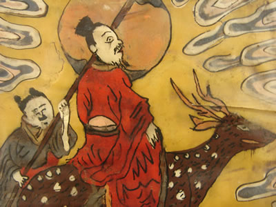 | 華角工芸とは牛の角を透明になるほど研ぎだして紙のように加工し、それに彩色を施して木地に貼り付けたものである。この三層チャンには囍文や牡丹、鳳凰、鹿、仙人を表した角紙が159枚貼り付けられている。華角華角は主に王宮や両班の女性の部屋に存在したものあり、富貴の象徴ともいえる。 | |