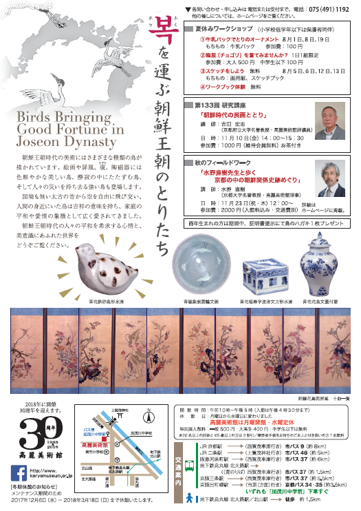 朝鮮王朝時代の絵画や屏風、硯、陶磁器、木工品には色鮮やかな美しい鳥、静寂の中にたたずむ鳥、そして人々の災いを持ち去る強い鳥が登場します。国境も無い昔から空を自由に飛び交う鳥は吉祥の意味をもち、平和や愛情の象徴として人々に愛されてきました。今回はさまざまな鳥と福をモチーフにした所蔵品80点による美の世界を展示いたします。